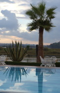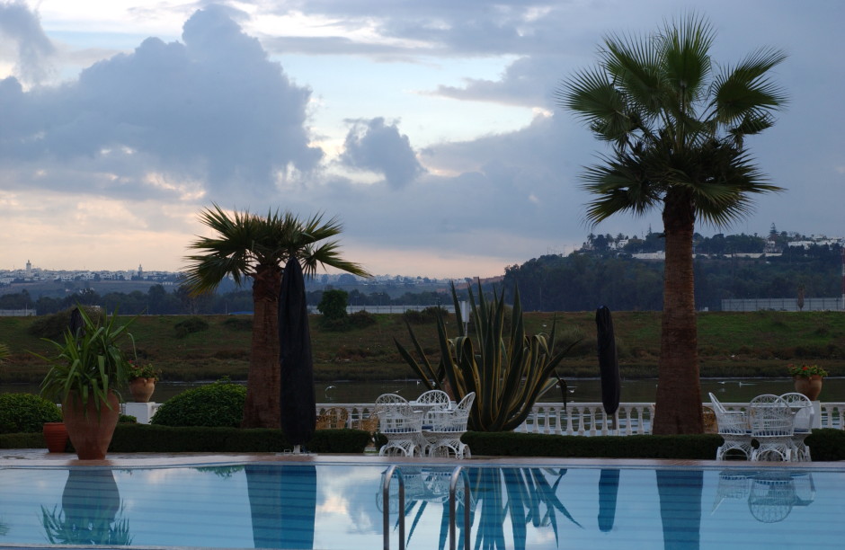 Poolside reflections and silhouettes in the waning light of day; Rabat/Salé, Morocco, North Africa. December 2007.