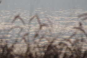Through the reeds and grasses onto a fog-shrouded Nile River awash in faded early morning light; Cairo, Egypt. December 2008.