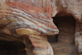 Tomb detail with color swirls in rose-colored sandstone; Petra, Jordan. December 2008.