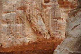Near the treasury; a multi-hued, concave rock face shaped by wind and weather; Petra, Jordan. December 2008.