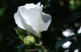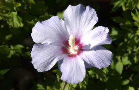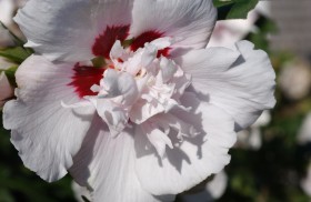 Rose of Sharon; white, red center; Oak Bluffs, Martha’s Vineyard Island, Massachusetts. September 2009.