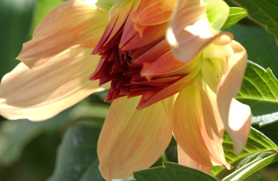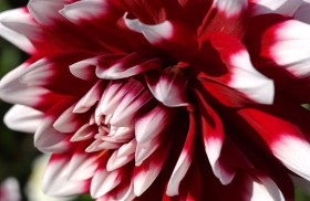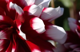 Red, whie two; dahlia detail; Oak Bluffs, Martha’s Vineyard Island, Massachusetts. September 2009.