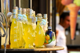 Limoncello, lemon liqueur; Amalfi, Italy. October 2009.