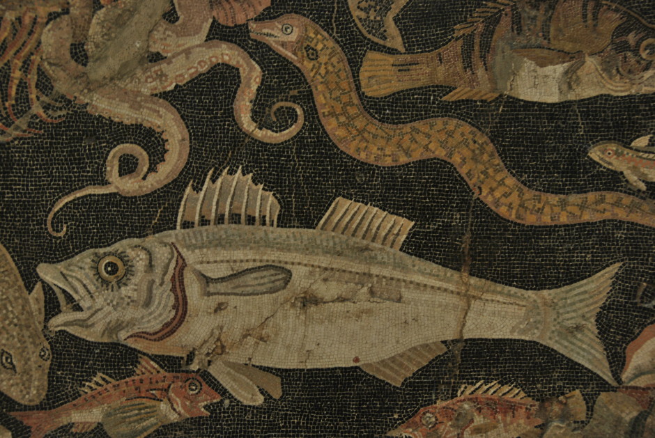 Undersea creatures; mosaic detail; National Archaeological Museum; Naples, Italy. October 2009.