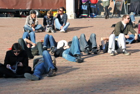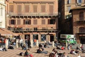 Beer break; Piazza del Campo; Siena, Italy. November 2009.