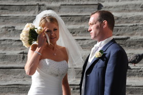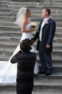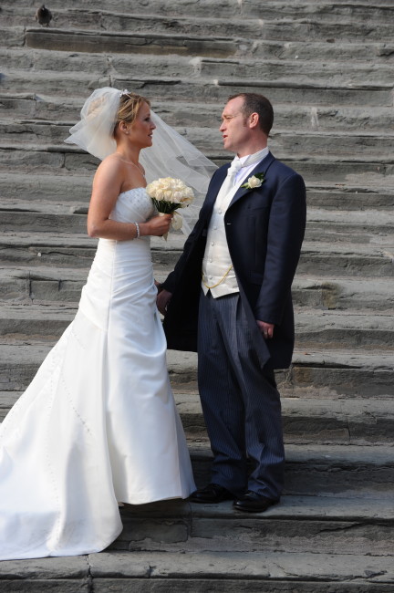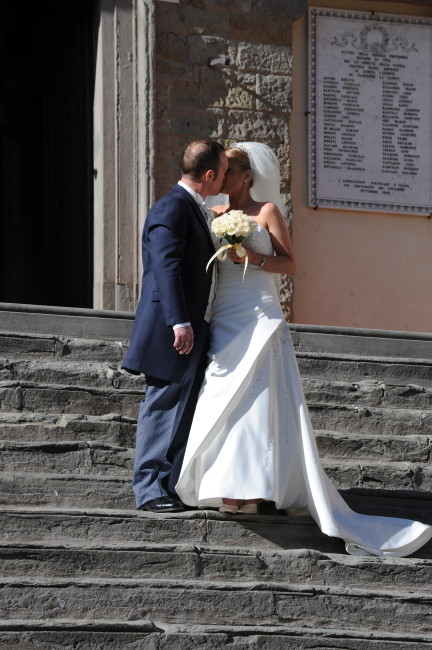 Pensive moment for the newly married; town hall steps, Cortona, Italy. November 2009.