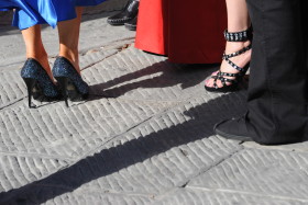 Wedding party fashions; town hall courtyard, Cortona, Italy. November 2009.
