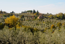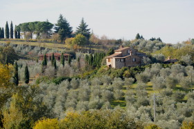 Olive trees; dwelling; Pienza, Tuscany, Italy. November 2009.