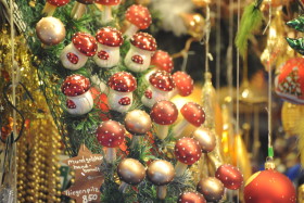 Cascade of mushrooms, Christmas Market, Esslingen, Germany. December 2009.