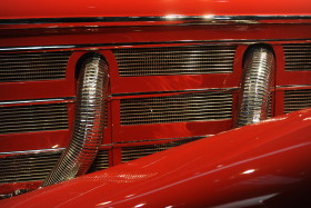 Red convertible side hood, fender details; chrome hoses, grillwork, trim; Mercedes-Benz Museum, Stuttgart, Germany. December 2009.