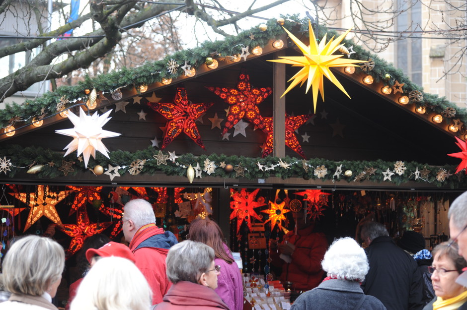 Star stall overview, Christmas Market, Esslingen, Germany. December 2009.