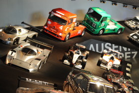Two workhorses among the Silver Arrow race cars; Mercedes-Benz Museum, Stuttgart, Germany. December 2009.