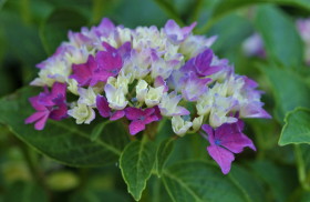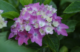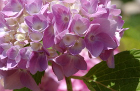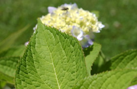Hydrangea bloom, leaf; Vineyard Haven, Martha’s Vineyard, Massachusetts, USA. June 2010.