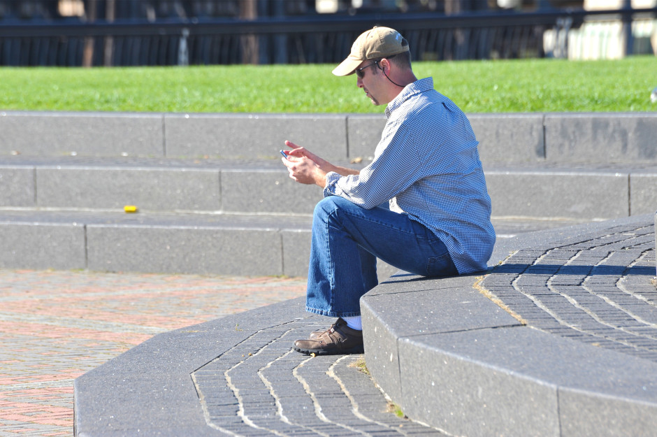 Checking in on a Sunday morning; Pier A Park, Hoboken, New Jersey, USA. October 2010.
