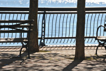 Bench, pavers, a fence and the Hudson River; Hoboken, New Jersey, USA. October 2010.