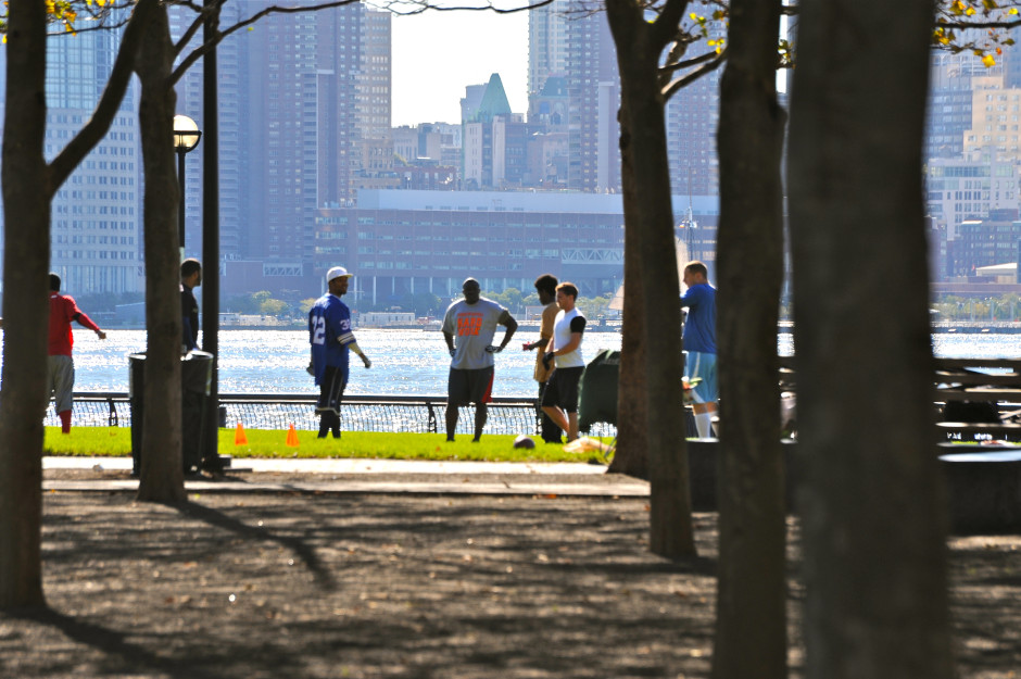 Sunday morning pickup game; along the Hudson River, New York City in background; Hoboken, New Jersey, USA. October 2010.