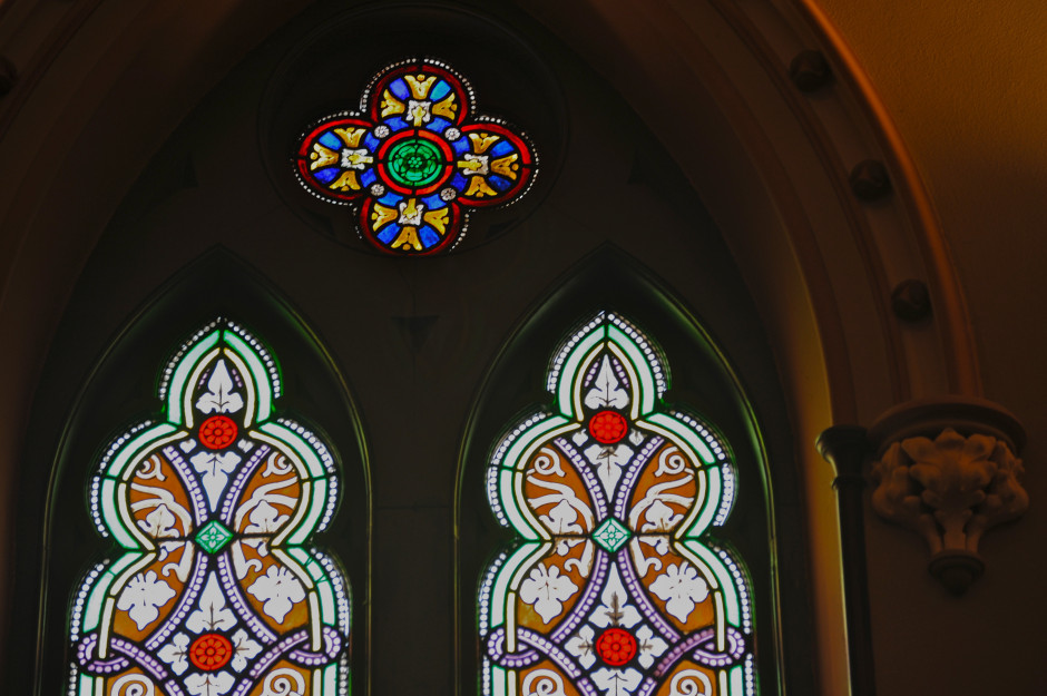 Blue accents; stained glass windows; Arch Street Methodist Church, Philadelphia, Pennsylvania, USA. November 2010.