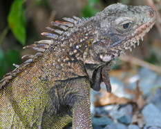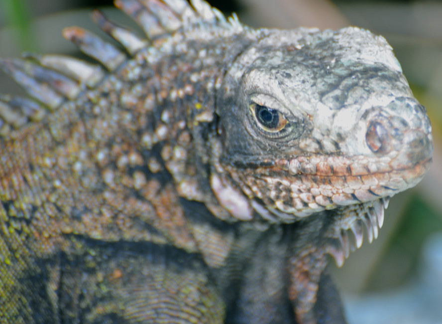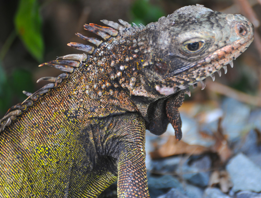 Close up; iguana; Maho Bay Camps, St. John, U.S. Virgin Islands. January 2011.