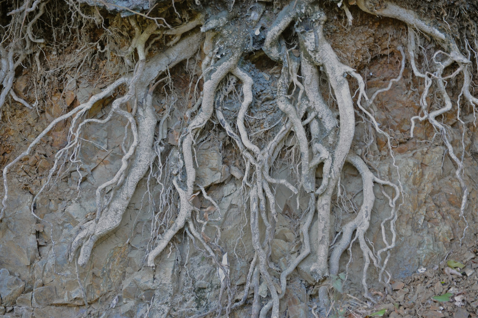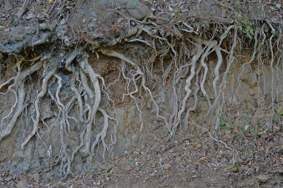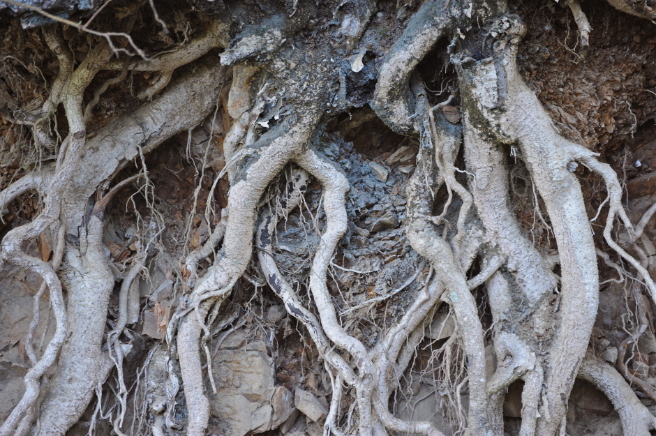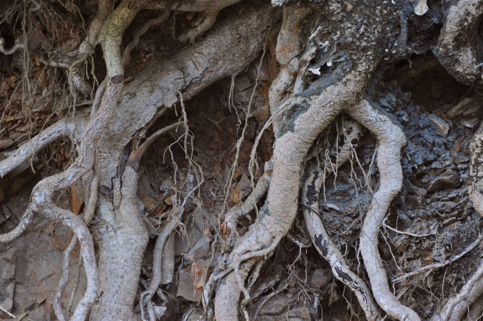 Downward; roots; Maho Bay Camp, St. John, U.S. Virgin Islands. January 2011.
