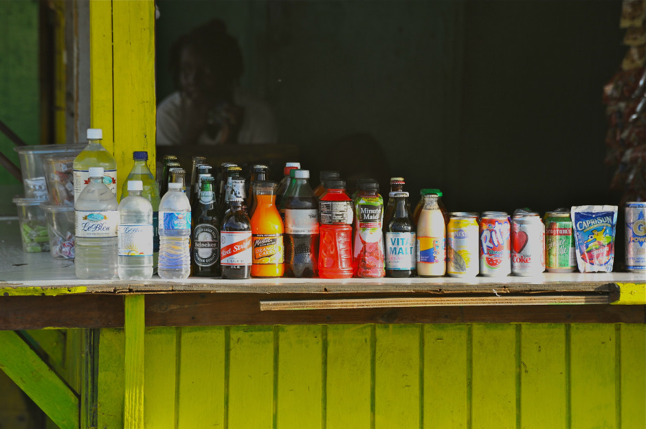 Red Stripe and friends; fruit stand; Cruz Bay, St. John, U.S. Virgin Islands. January 2011.