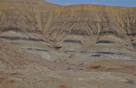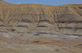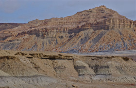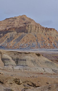 Looking across to decaying cliffs; Grand Staircase-Escalante National Monument at Big Water, Utah, USA. March 2012.