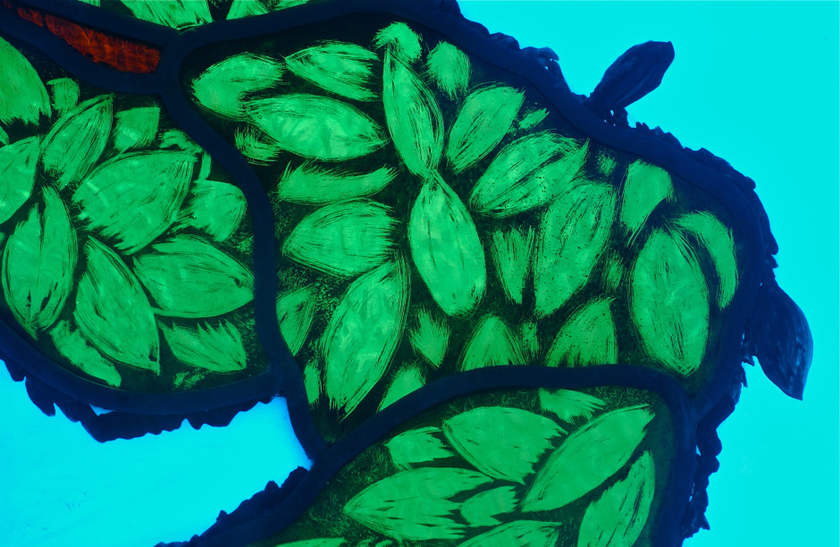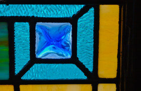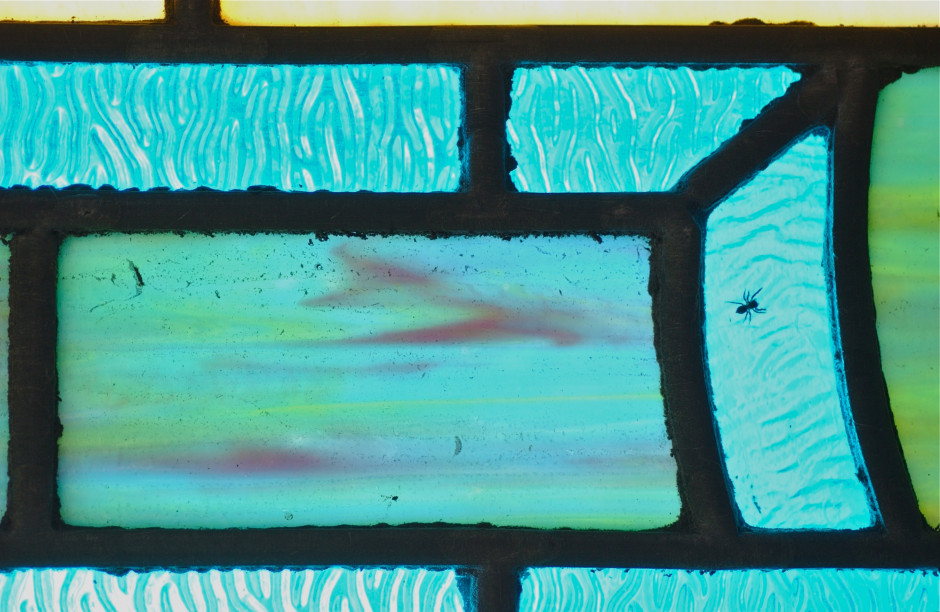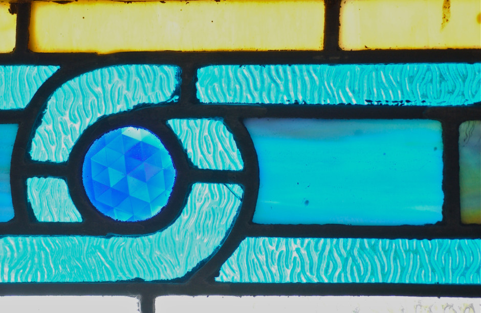 Window detail; turquoise, blue; Temple Performing Arts Center, formerly the Baptist Temple, Philadelphia, Pennsylvania, USA. April 2012.