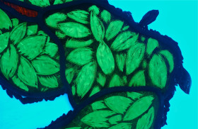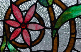 Window detail; poinsettia two; Temple Performing Arts Center, formerly the Baptist Temple, Philadelphia, Pennsylvania, USA. April 2012.