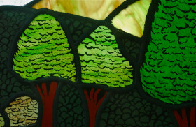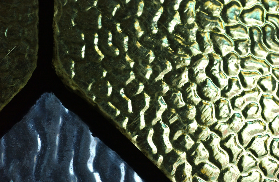 Window detail; green gold; Temple Performing Arts Center, formerly Baptist Temple, Philadelphia, Pennsylvania, USA. April 2012.