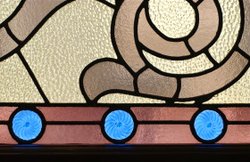 Window detail; blue jewel; Temple Performing Arts Center, formerly the Baptist Temple, Philadelphia, Pennsylvania, USA. April 2012.