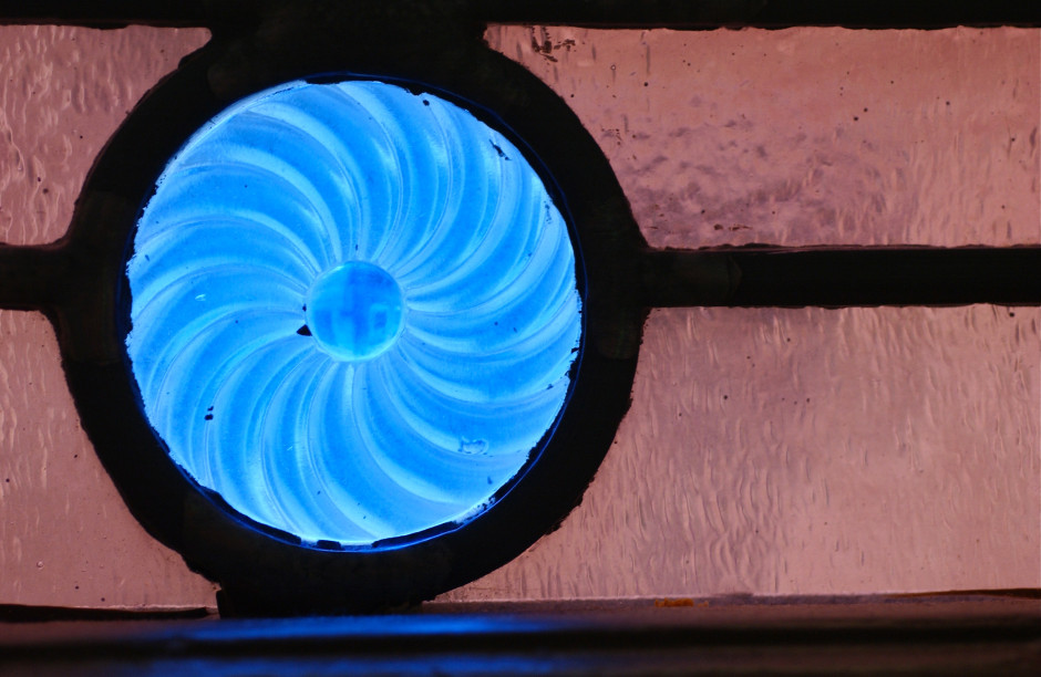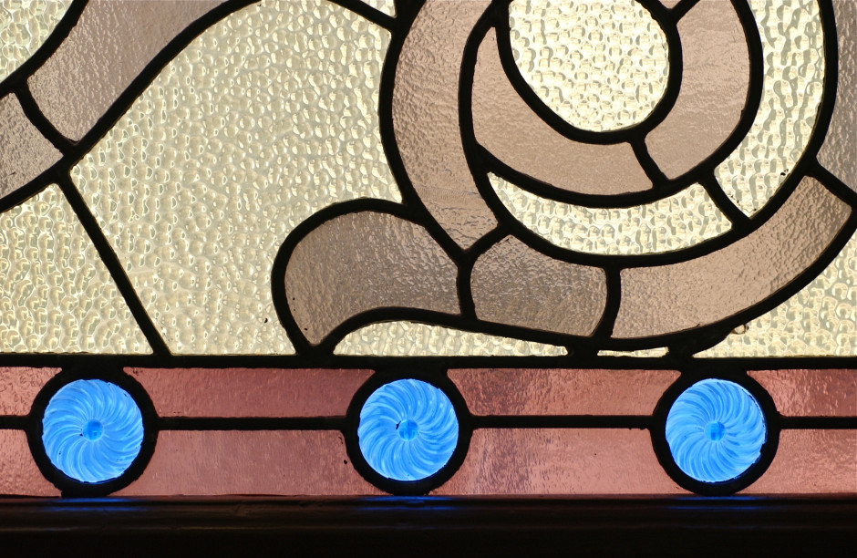 Window detail; blue spinner; Temple Performing Arts Center, formerly Baptist Temple, Philadelphia, Pennsylvania, USA. April 2012.