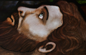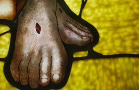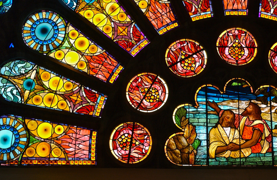 Window detail; crucifixion; Temple Performing Arts Center, formerly Baptist Temple, Philadelphia, Pennsylvania, USA. April 2012.