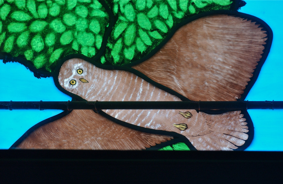 Window detail; owl; Temple Performing Arts Center, formerly Baptist Temple, Philadelphia, Pennsylvania, USA. April 2012.