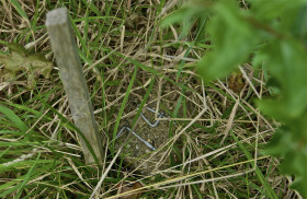 Stake, grave marker four; Marine Hospital Cemetery; Seaman’s Friend Society Cemetery; Vineyard Haven, Martha’s Vineyard, Massachusetts, USA. August 2012