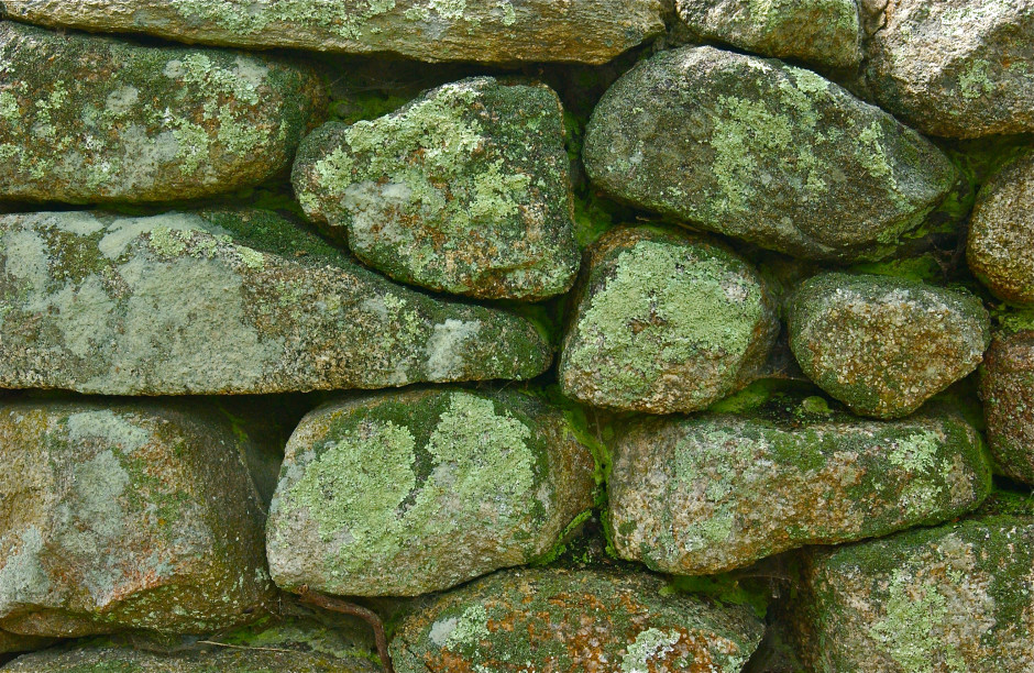 Leichen-covered; stone walls of Chilmark; Fulling Mill, along South Road; Martha’s Vineyard, Massachusetts, USA. August 2012.