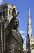 Frank Rizzo sculpture, Arch Street Methodist Church spire; Center City Philadelphia, Pennsylvania, USA. September 2012.