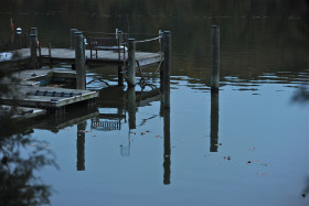 Spindly pier at the bend; soft October light; Churn Creek; Worton, Maryland, USA. October 2012.