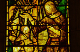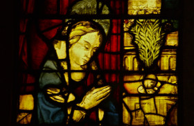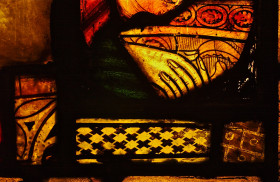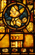 Prayer detail; composite replacement glass; 15th, 16th century French Gothic chapel; Philadelphia Museum of Art, Philadelphia, Pennsylvania, USA. December 2012.