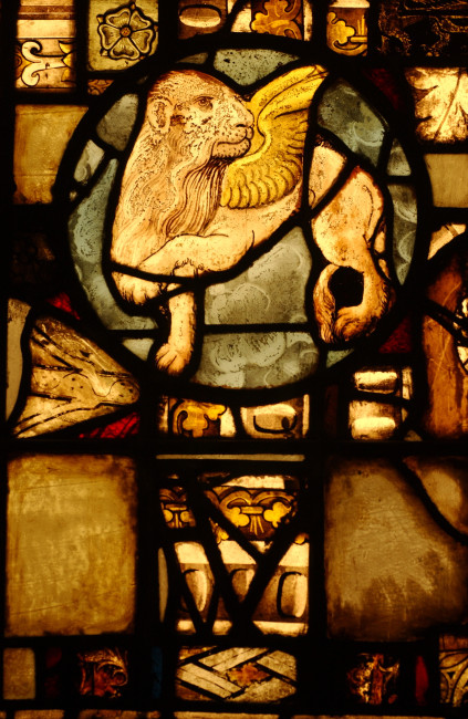 Winged creature; composite replacement glass; 15th, 16th century French Gothic chapel; Philadelphia Museum of Art, Philadelphia, Pennsylvania, USA. December 2012.