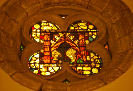 Oval window; composite replacement glass; 15th, 16th century French Gothic chapel; Philadelphia Museum of Art, Philadelphia, Pennsylvania, USA. December 2012.