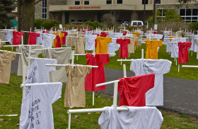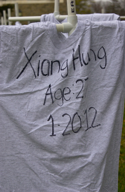 Xiang; protesting gun violence; 331 deaths in 2012; Presbyterian Church of Chestnut Hill; Philadelphia, Pennsylvania, USA. January 2013.
