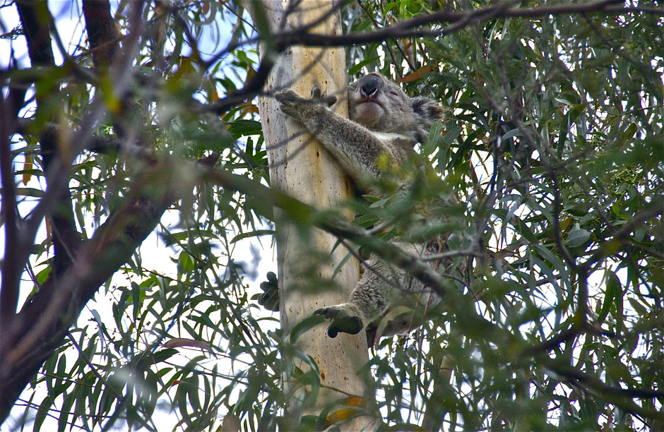 Koala hanging on, feet free; Western Plains; Victoria; Australia. January 2014.