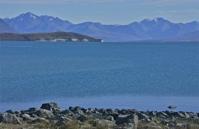Rugged terrain; blue sky, blue water; Lake Tekapo, Canterbury District, South Island, New Zealand. January 2014.