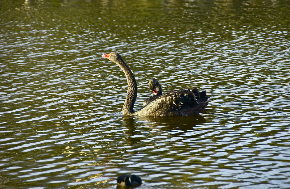 Bath time on the Torrens; black swans; Adelaide, South Australia, Australia. January 2014.
