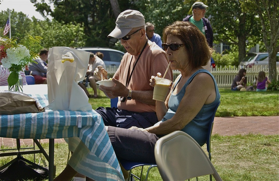 Taking a break, digging in; peach festival; First Congregational Church, West Tisbury, Martha’s Vineyard, Massachusetts, USA. August 2014.