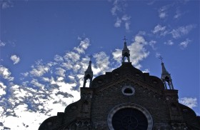 Tower detail in silhouette; black on mottled blue; Santa Maria Gloriosa dei Frari; Venice, Italy. December 2014.