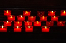 Red votive candles; church interior; Murano, Italy. December 2014.