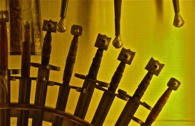 Sword handles, hilts in silhouette; Doge’s Palace; St. Mark’s Square; Venice, Italy. December 2014.