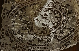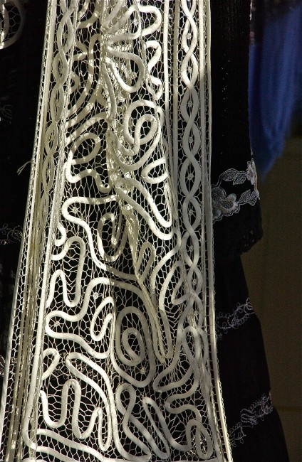 Clothing detail; in white, gold; Burano, Italy. December 2014.
