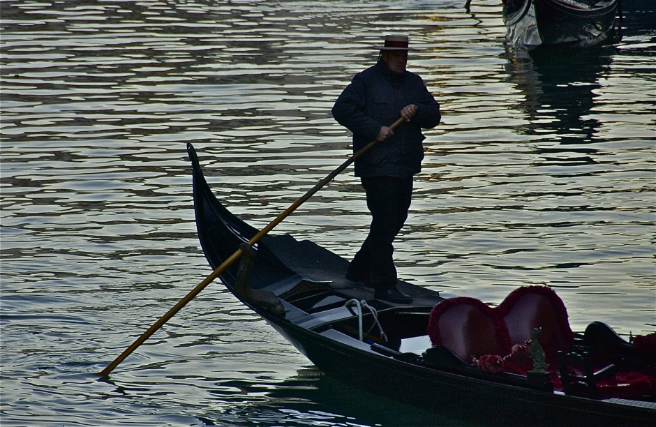 Late in the day; gondolier in silhouette; Venice, Italy. December 2014.