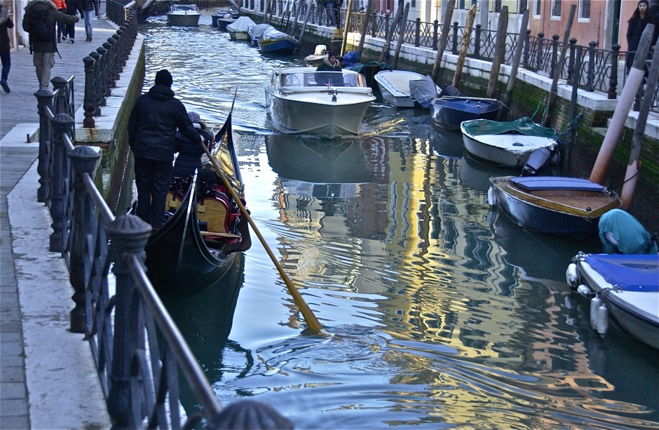 Out of the shadows; on the canal; Venice, Italy. December 2014.
